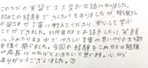 今回の実習での経験を生かして、介護の世界で将来活躍していただけることを切に願っています。