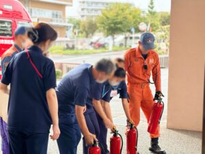 訓練終了後には、水消火器を使用した消化訓練を行い、